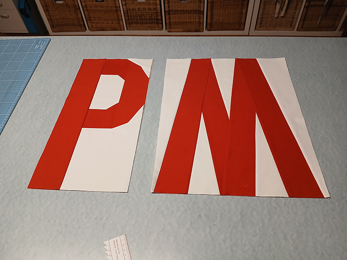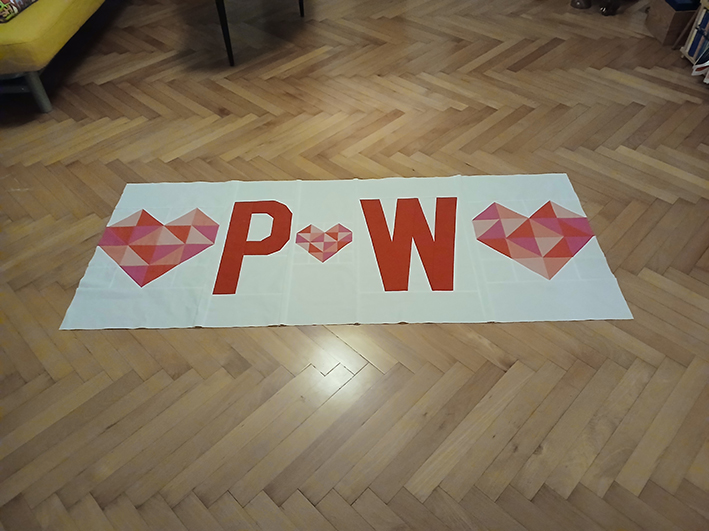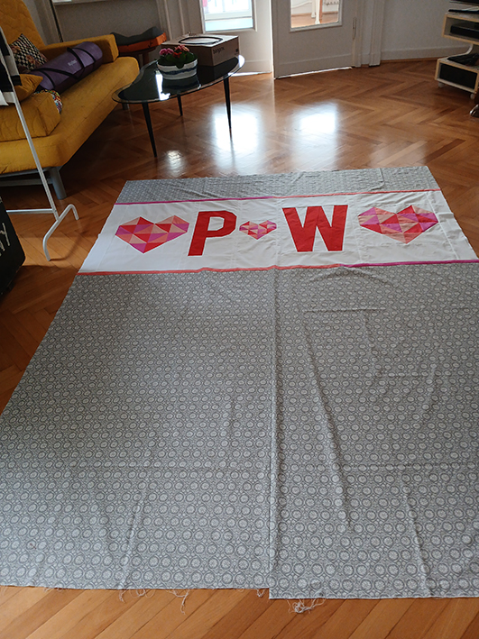 Die HSTs und der Kreis waren dagegen eine vergleichsweise leichte Übung. Fleißarbeit halt. Und dann wurde es spannend. Passen alle Bestandteile so zusammen, wie geplant? Fehlt nicht doch noch ein bisschen Nahtzugabe? Löst sich auch kein Buchstabe?