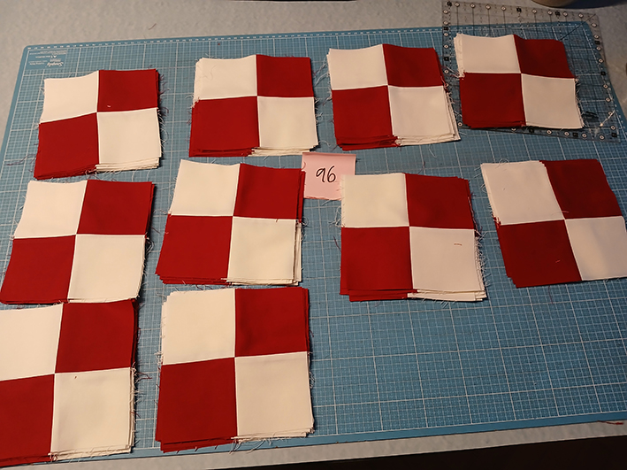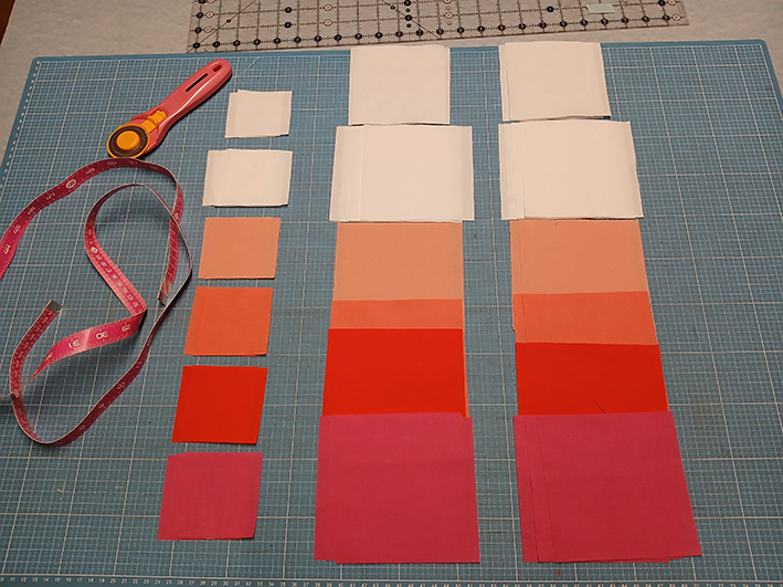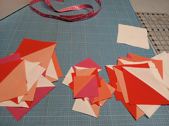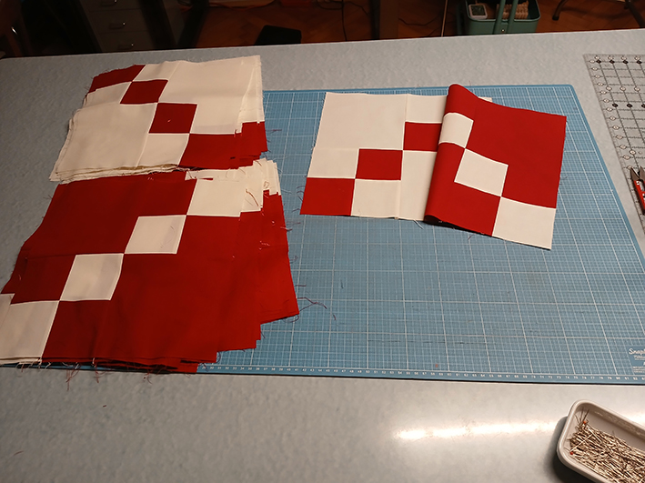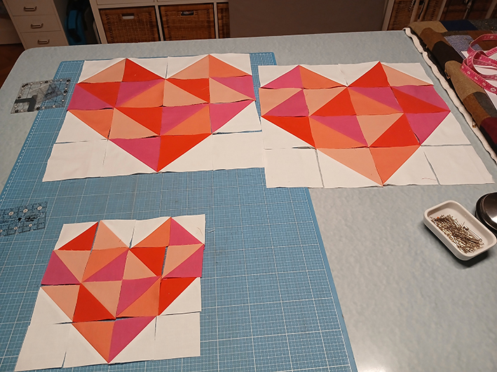 Die ersten Blöcke waren schnell genäht, allein bei den Hourglasses habe ich mich ein bisschen angestellt. In der Anleitung werden sie aus einzelnen Dreiecken zusammengesetzt. Das wollte ich nicht und habe für eine vermeintlich einfachere Lösung viel gerechnet und ausprobiert.