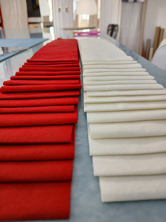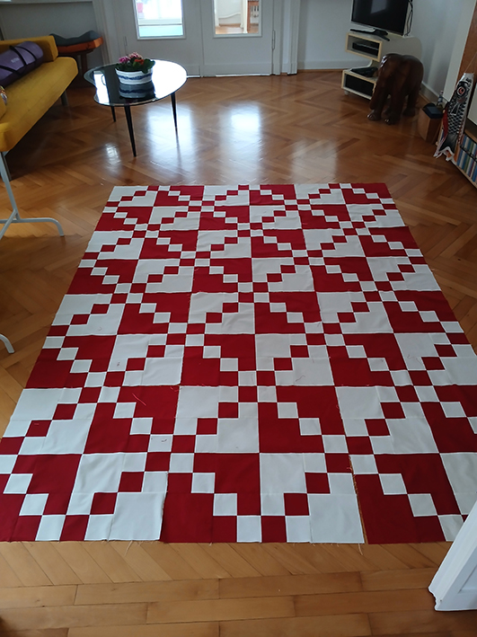 Das ist ganz schön viel Material unter der Maschine, und ich weiß nicht, wie oft mir der ganze Klimbim hinter den Tisch gerutscht ist. Man wäscht die Decke nicht, um sie ein bisschen schrumpfen zu lassen, sondern weil sie im Entstehungsprozess einfach durch so viel Staub und Dreck gezerrt wird. Oder?