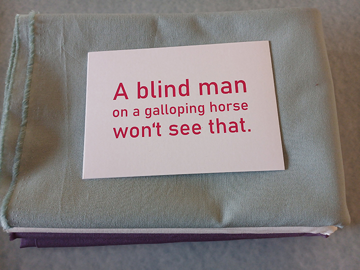 Eigentlich wollte ich das Binding aus dem gepunkteten Stoff machen, der schon die Bilder umgibt, aber das war mir dann doch zu grün. Der sanfte Salbeiton gefällt mir ausnehmend gut zu den anderen Farben und macht mich froh. Wie immer von hinten mit der Hand genäht. Und ein wonky Label darf auch nicht fehlen. Den Rückseitenstoff mit dem schönen Blumenmuster hüte ich schon lange. Er sollte mal eine Bluse werden und ist jetzt sehr viel glücklicher mit seiner neuen Rolle.